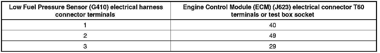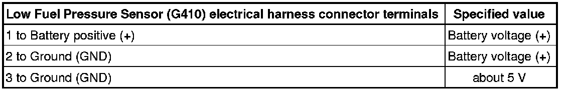 - Using a multimeter, check the Low Fuel Pressure Sensor (G410) electrical harness connector for voltage.