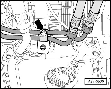 - Remove bolt - arrow - and disconnect ATF-lines from transmission.