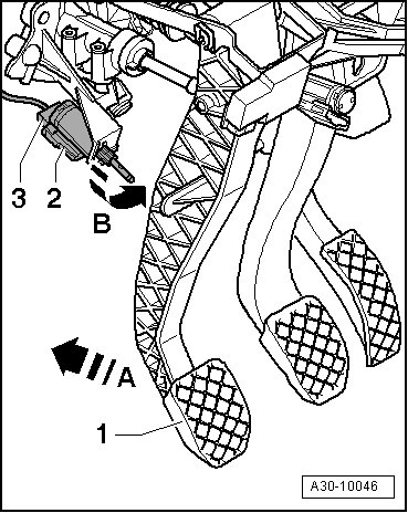 • The clutch pedal - 3 - is in the normal position (i.e. not pressed down). The operating rod - arrow - of the clutch pedal switch (F36) should then rest against the clutch pedal.