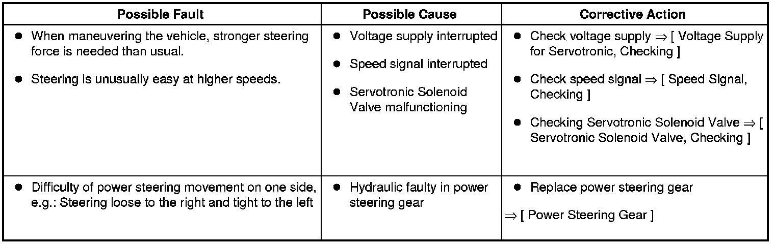 Servotronic Steering Gear Fault Table