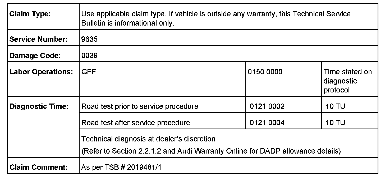 All warranty claims submitted for payment must be in accordance with the Audi Warranty Policies and Procedures Manual. Claims are subject to review or audit by Audi Warranty.