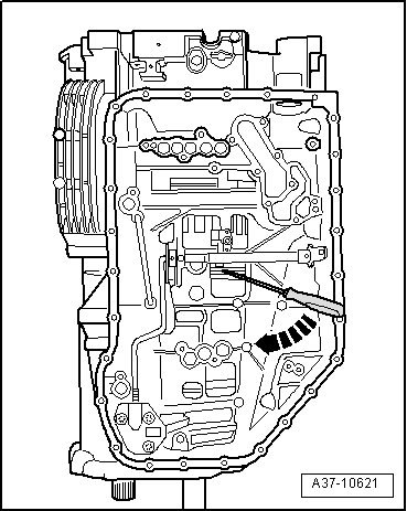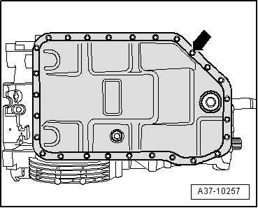 - Loosen ATF oil pan bolts - arrow - in a diagonal sequence and then remove them completely.
