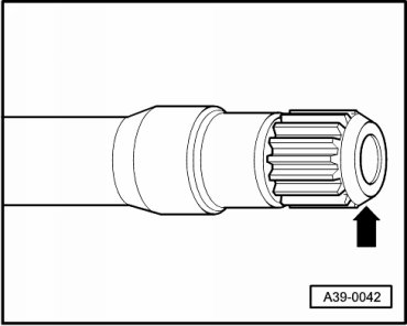 - Completely cover splines - arrow - on left flange shaft with insulating tape without wrinkling or overlapping to avoid damaging final drive/transmission housing double shaft seal when installing flange shaft.