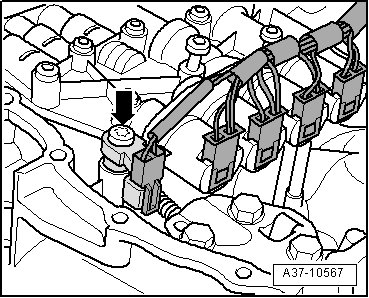 - In a transmission with hydraulic control "E18/2", disengage electrical connector to Transmission Input Speed (RPM) Sensor (G182) at valve body - arrow - and disconnect connector.