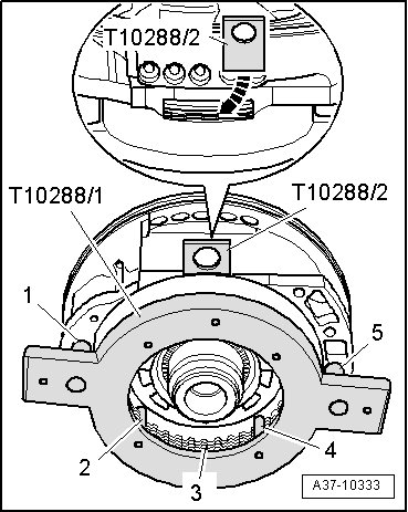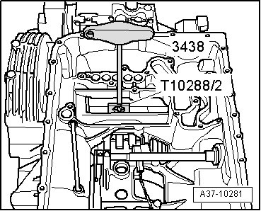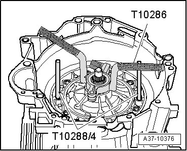 - Carefully remove centering tool (T10288/3) upward, guide pins (T10288/4) remain in transmission housing.
