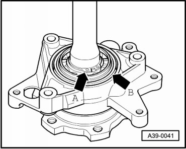 - Replace O-ring - arrow B - in mounting bracket for left flange shaft.