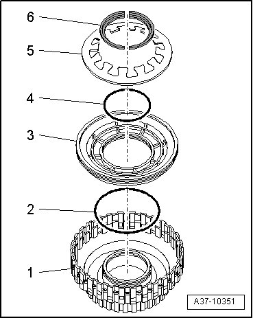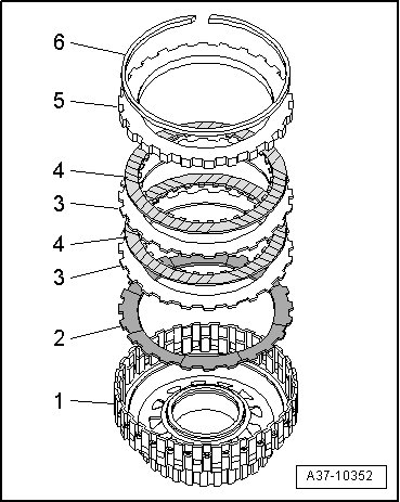 Illustration depicts current construction version of clutch " B" with waved washer - 2 -, 2x outer plates - 3 - and 2x coated plates - 4 -. Clutch "B" must be replaced on older versions without waved washer and with 3x lining and outer discs each.