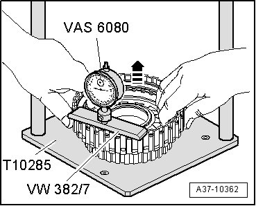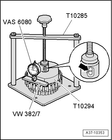 - Insert dial gauge (VAS 6080) into measuring bar (VW 382/7) and tighten knurled nut.