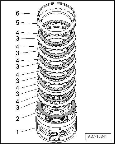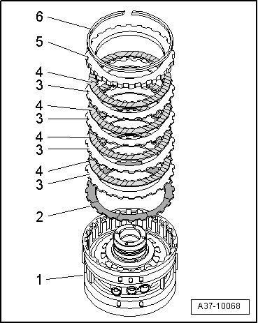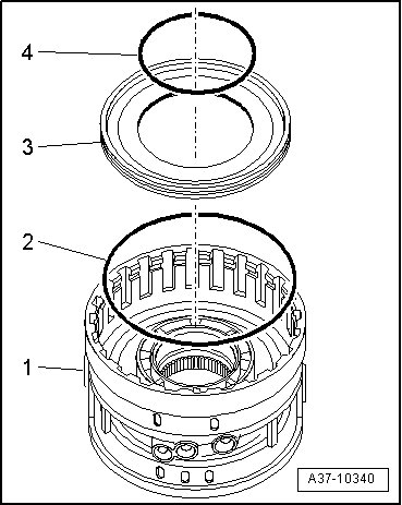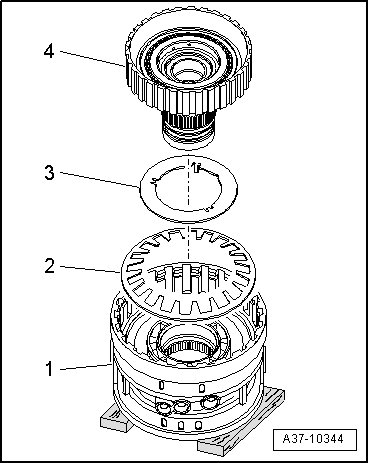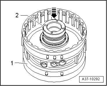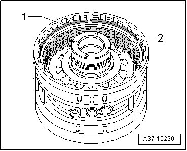 - Remove circlip - 1 - and remove plate pack - 2 - from cylinder "D/G".