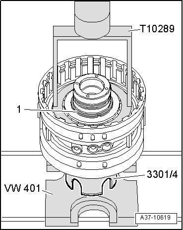 - Push thrust washer fully downward and insert circlip - 1 -.