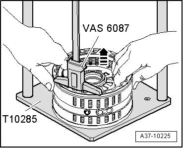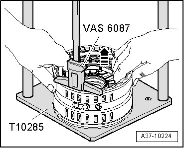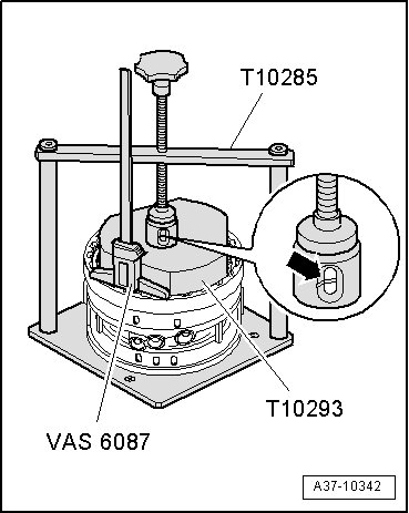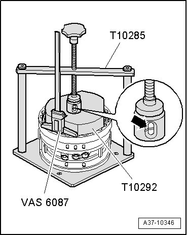- Insert pressure unit (T10285/1) with centering pin into bore of plate.