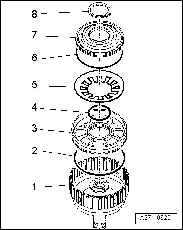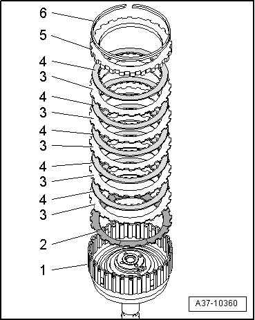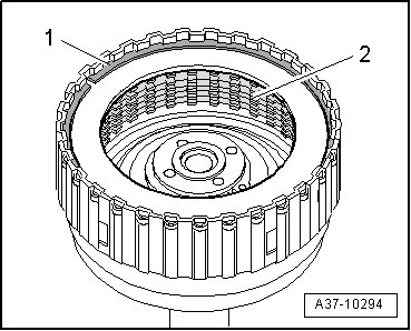 - Remove circlip - 1 - and remove plate pack - 2 - from cylinder "E".