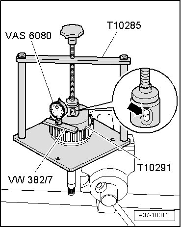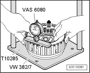 - Insert dial gauge (VAS 6080) into measuring bar (VW 382/7) and tighten knurled nut.