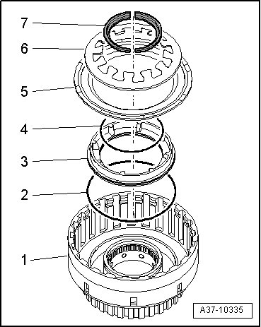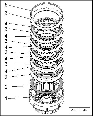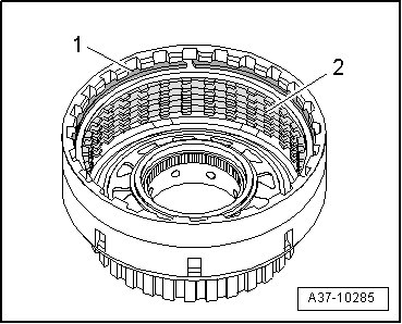 - Remove circlip - 1 - and remove plate pack - 2 - from cylinder "F".