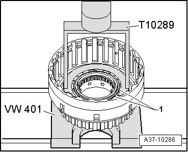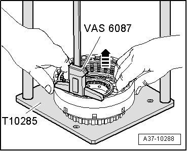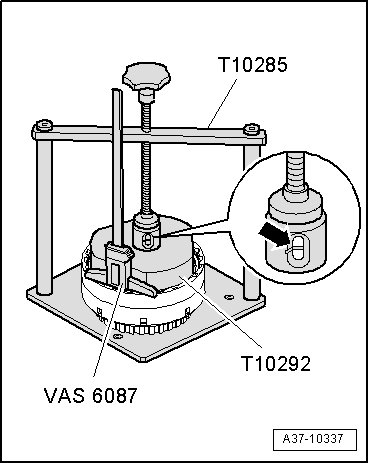 - Insert pressure unit (T10285/1) with centering pin into bore of plate.