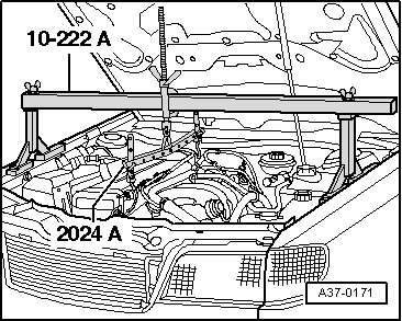- At the same time lower engine/transmission-assembly using Engine/Transmission Jack (V.A.G 1383 A) (second technician).
