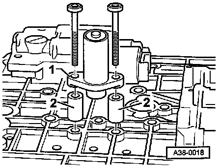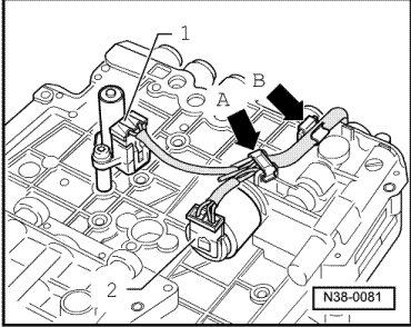 - Position Transmission Input Speed (RPM) Sensor ( G182) - 1 - with spacer sleeves - 2 - on valve body and tighten bolts.