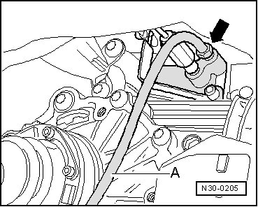 - Connect bleeder hose - A - to slave cylinder - arrow - and open bleeder valve.