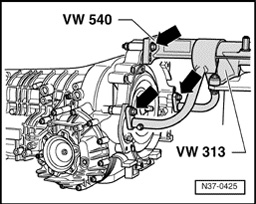 - Bolt transmission onto engine/transmission holder VW 540 -arrows-.