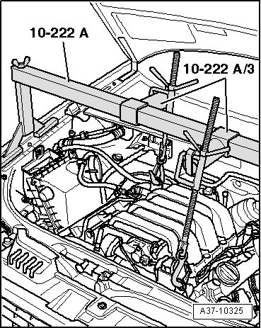 - Lower the engine again using the spindles of the engine support bridge (10-222 A).