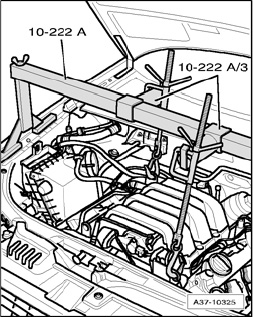 - Raise engine using spindles of engine support bridge 10-222 A far enough until both nuts -3- (on left and right sides) make contact on from below.