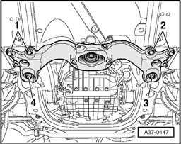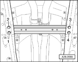 - Remove bolts - 1 through 4 - and remove front cross member for vehicle floor.