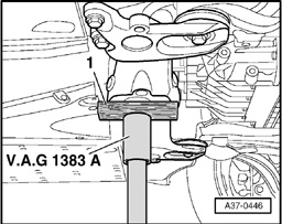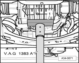 - Place plunger of Engine/Transmission Jack V.A.G 1383 A with a block of wood inserted in between -1- on transmission at bottom.