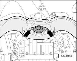 - Loosen bolts -arrows- at torque support stop approx. two rotations each.