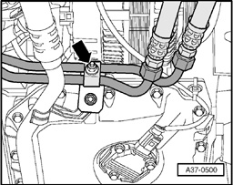 - Remove bolt -arrow- and remove ATF lines from transmission.
