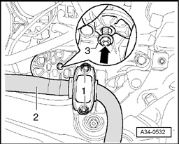 - Remove nuts -3- at engine mount on left and right far enough until lower edge of nut is flush with threaded pin -arrow-.