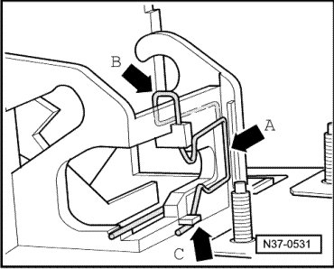 - Insert the spring - arrow B - from the top and hook in at the retaining clip - arrow C -.