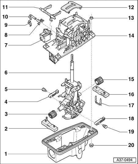 - Pull selector lever -6- with bushings -3- and -15- as well as Tiptronic locking levers -4- and -18- downward out of shift unit -14-.