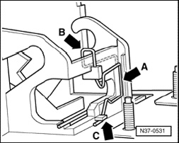 - Insert spring -arrow B- from top and hook in at retaining clip -arrow C-.