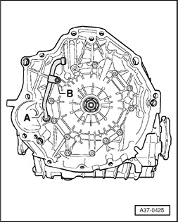 ^ If ATF leak is determined from check hole behind ATF breather pipe -A- at level of bolt -B-, transmission is malfunctioning and must be replaced.