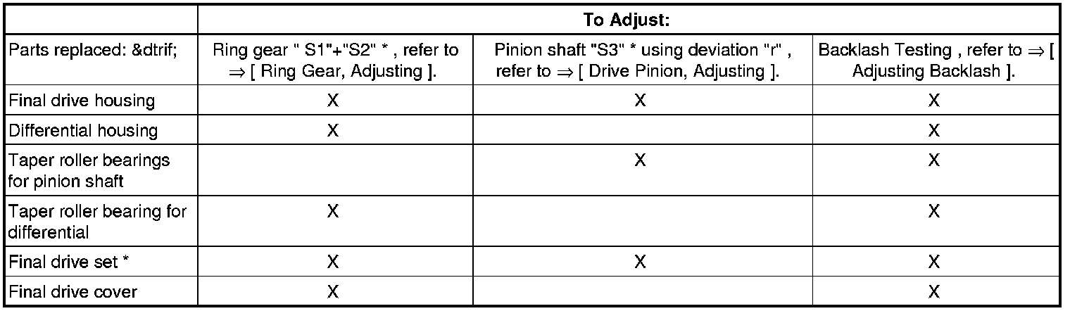 • If performing assembly work on the final drive it is only necessary to adjust the drive pinion or final drive set if components have been replaced which have a direct effect on the adjustments of the final drive. To eliminate unnecessary adjustments observe following table: