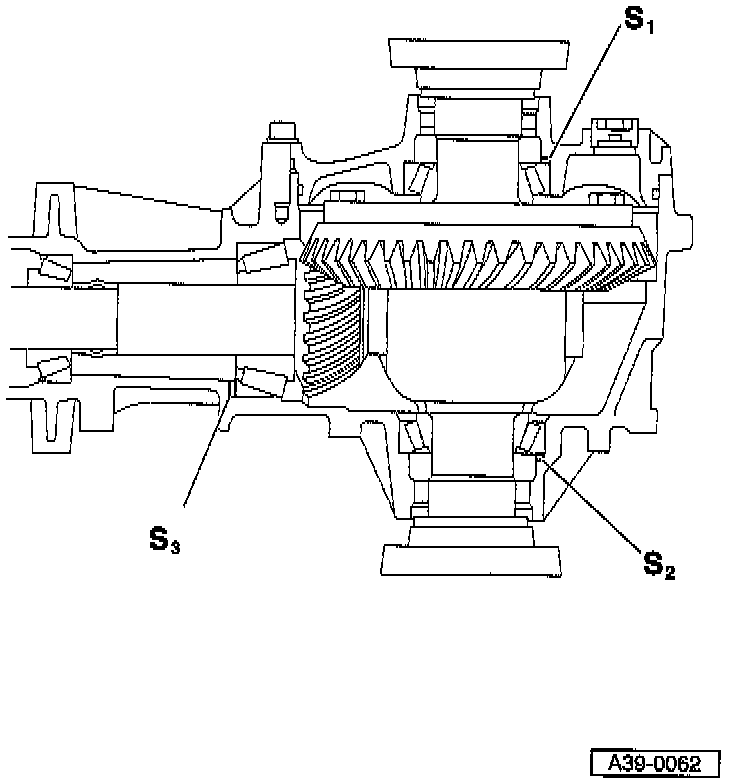 • Careful adjustment of the drive pinion and ring gear is important for the service life and smooth running of the final drive. For this reason, the drive pinion and ring gear are matched together during manufacture, and checked to ensure a good mesh pattern and quiet running in both directions of rotation. The position of quietest running is found by moving the drive pinion in an axial direction and at the same time lifting the ring gear out of the zero-play mesh position by the amount necessary to maintain the backlash within the specified tolerance.