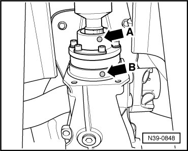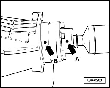 - Check whether there is a factory marking (paint dot) on driveshaft. If you do not find one, mark position of the driveshaft flange - arrow A - relative to rear final drive - arrow B - with a colored dot.