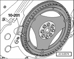 - Insert counter hold tool 10-201 to loosen bolts.