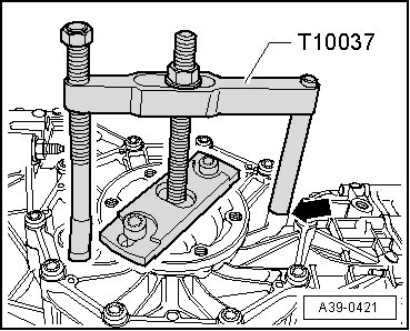 - Remove flange shaft (right side); by securing puller (T10037) to transmission housing - arrow -.