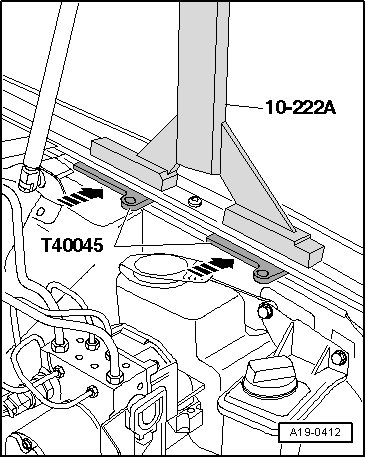 - To avoid damaging edges of fenders with engine support bridge (10-222 A), insert wing compensation plates (T40045) on both sides between fender mounting flange and body panel underneath.
