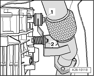 - Remove bolt - 1 - and nut - 2 - and detach retaining bracket for front exhaust pipe.