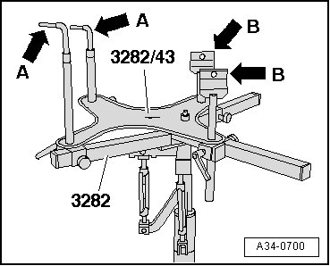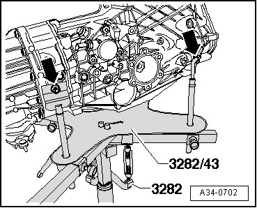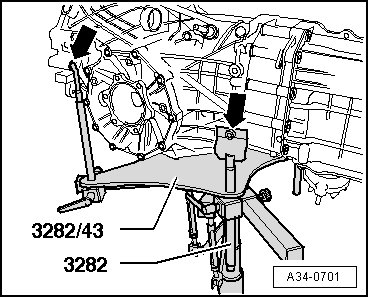 - To remove manual transmission 01X, set up transmission support (3282) with adjustment plate ( 3282/43) and place on engine and transmission jack (VAG 1383 A).