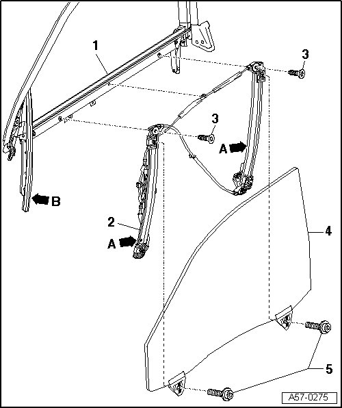 • Unscrew bolts - 5 - and remove door windows from window regulator.