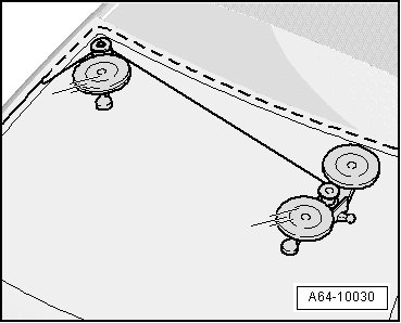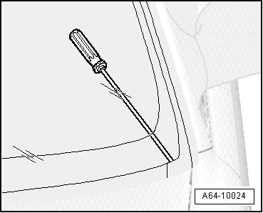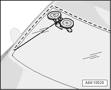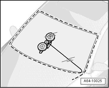 - Pierce hole in adhesive sealing material from inside of vehicle using awl (V.A.G 1755) or awl (V.A.G 1351) at bottom-left of windshield.