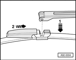 - Insert joint of wiper arm in guide on wiper blade - arrow 1 - . Ensure joint is inserted fully in guide.