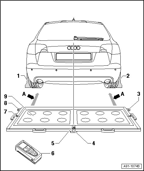- Position the calibration device behind the vehicle, 1.47 to 1.9 meters from the rear wheels, refer to - dimension A - in the overview, Sedan /Avant.