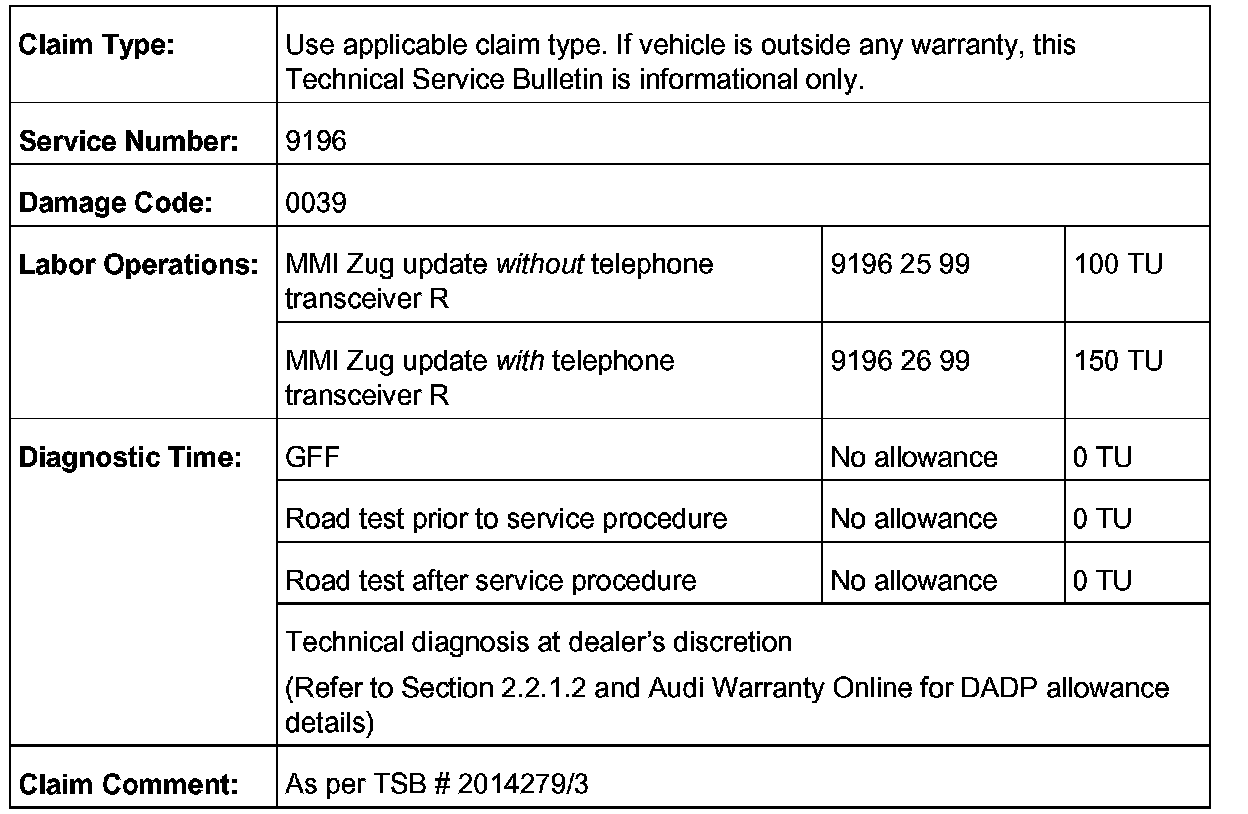 All warranty claims submitted for payment must be in accordance with the Audi Warranty Policies and Procedures Manual. Claims are subject to review or audit by Audi Warranty.