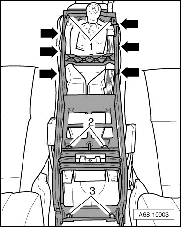 - Disengage sides of carpet from center console frame - arrows -.