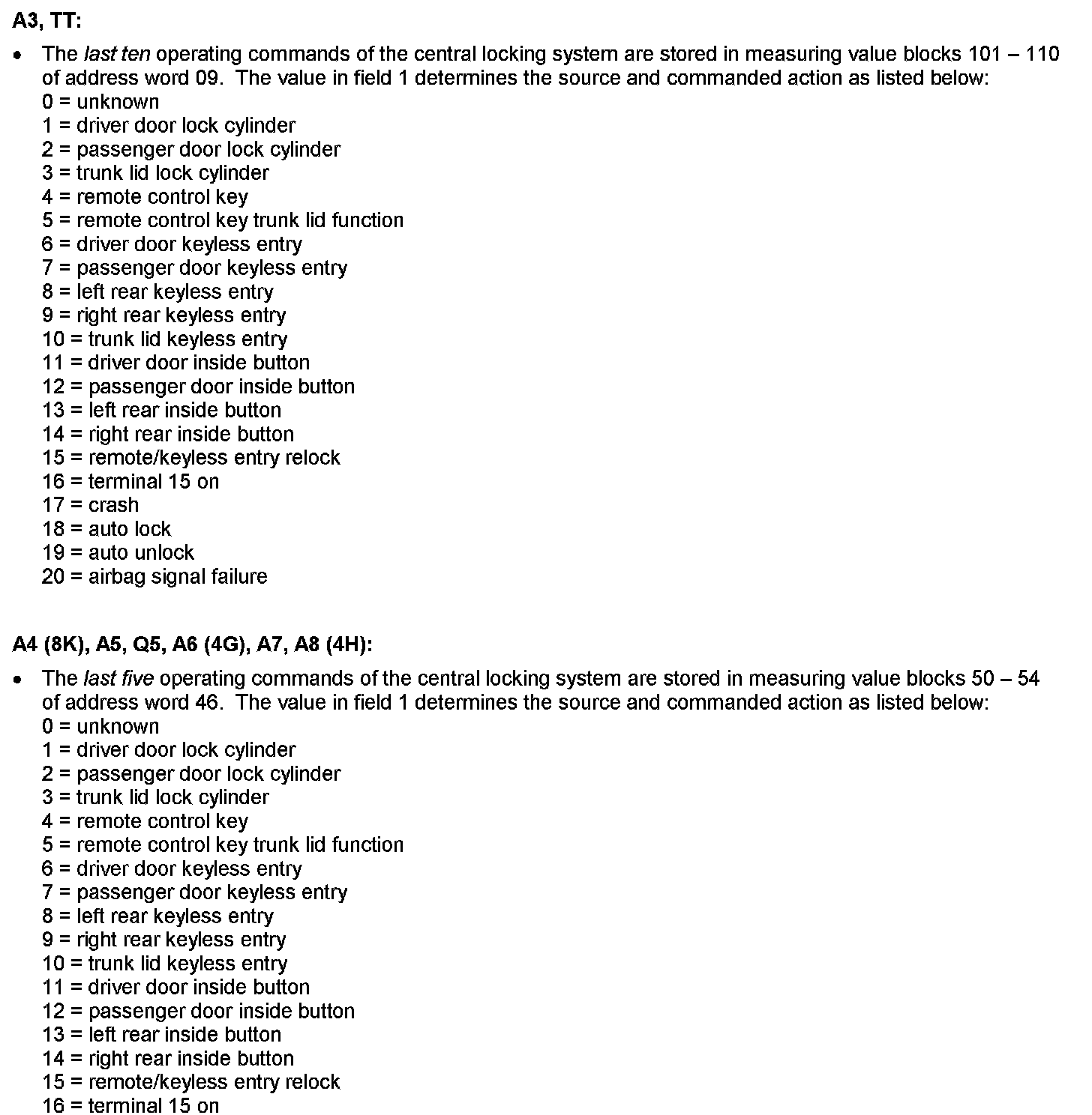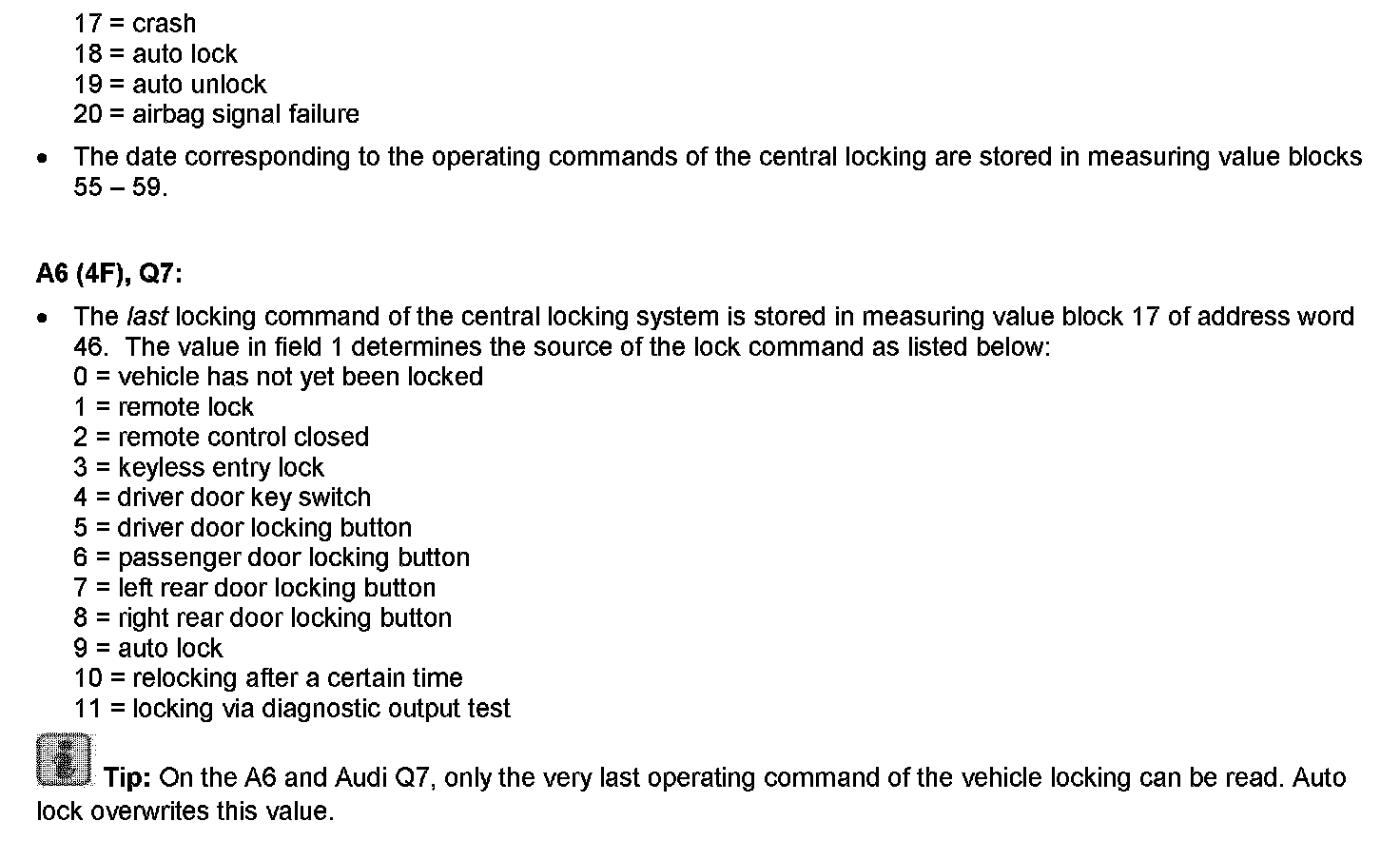 The previous central locking system commands can be determined from the measured value blocks shown above in the convenience system control module.