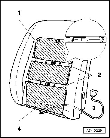 - Align heating element - 1 - on backrest surface, remove protective foil and glue heating element to cushion.